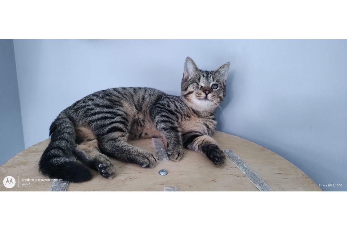 Kliper - uroczy, bury kocurek urodzony w maju 2025 roku.Los nie był dla niego łaskawy – przez ciężki koci katar stracił jedno oczko, a drugie jest w trakcie diagnozy. Ale wcale go to nie zatrzymuje!
