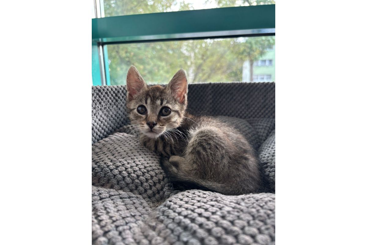BIGOS - urodzony w sierpniu 2025. Jest wesołym kociakiem mimo trudnego startu. Bezdomność i koci katar dały się we znaki temu małemu kociakowi. Jego prawe oczko jest mniejsze i ma widoczną gołym okiem plamkę, która powoduje że na to oczko nie widzi. Prawe oko na szczęście ma zdrowe.