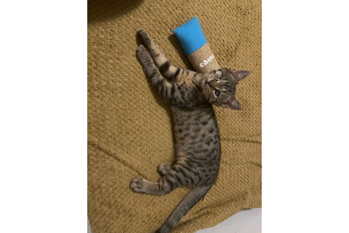 Bigosik lubi zabawy wędką, nie pogardzi też zwyczajnym kawałkiem papierka - ze wszystkiego zrobi sobie zabawkę. Najlepiej spędza mu się czas na mięciutkich posłaniach, albo na człowieku. Kuwetkuje już prawie bezbłednie.