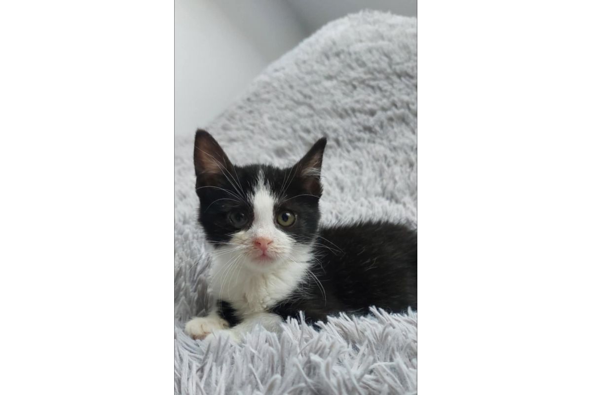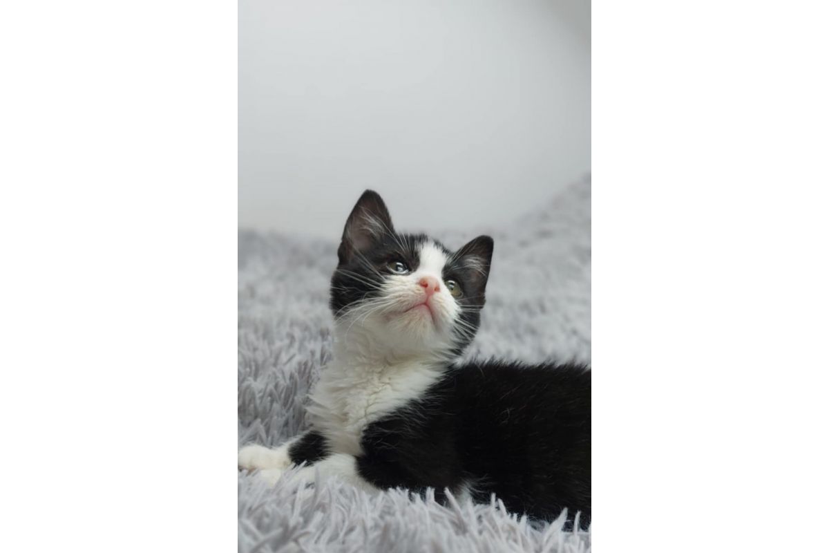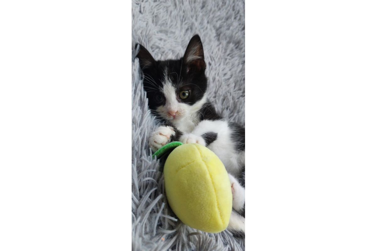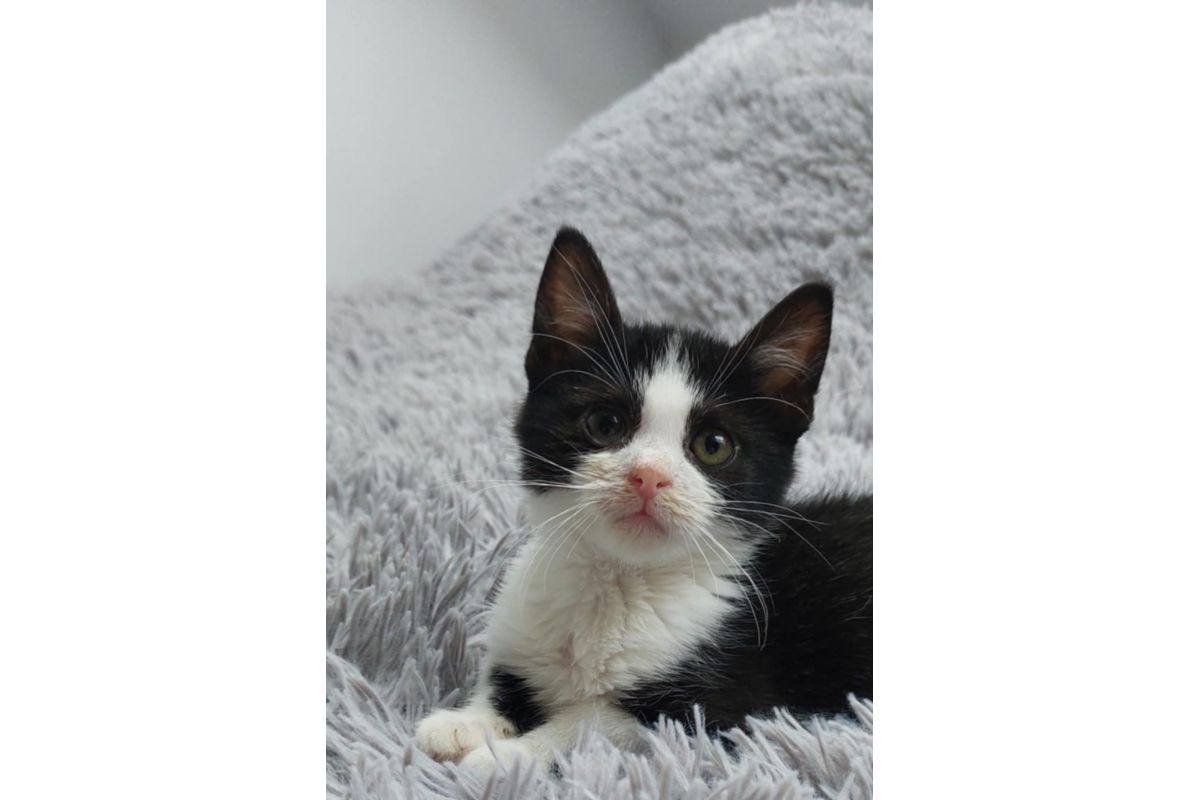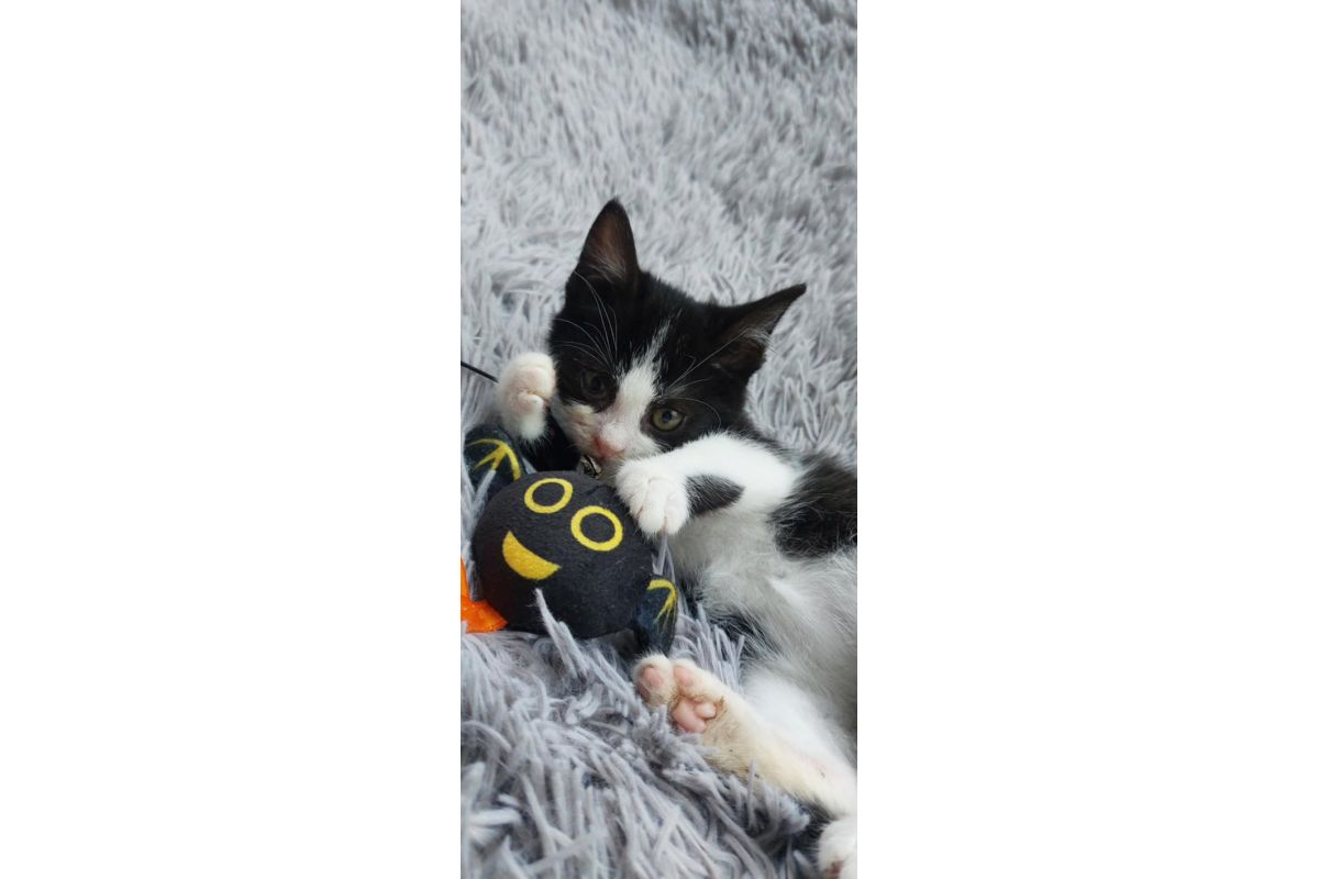 Obecnie przebywa w domu tymczasowym u jednej z naszych pracownic, tam uczy się kociego życia i… idzie mu doskonale!