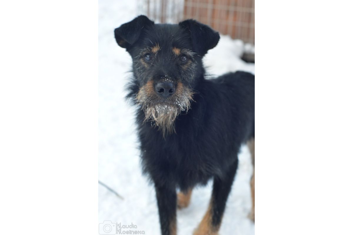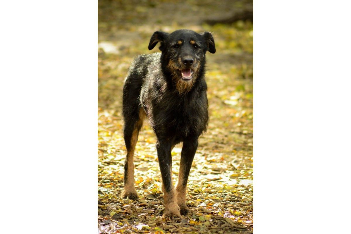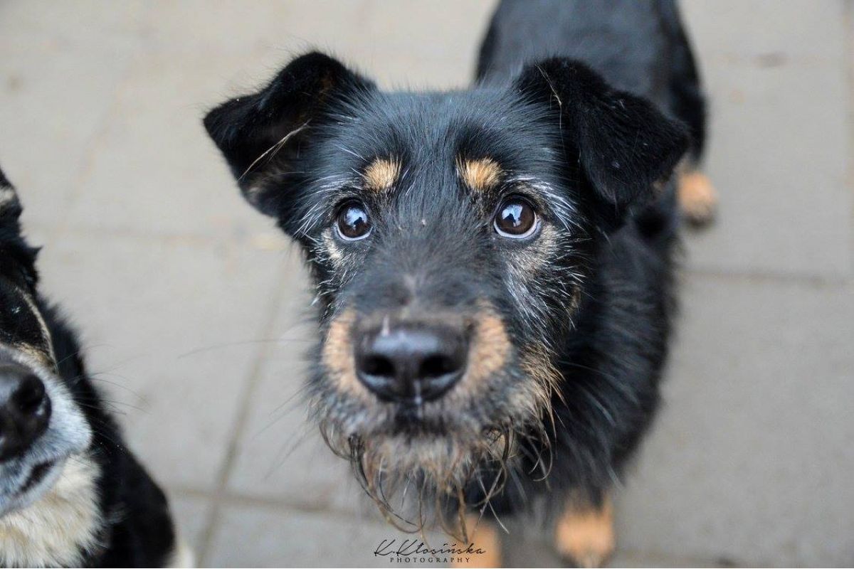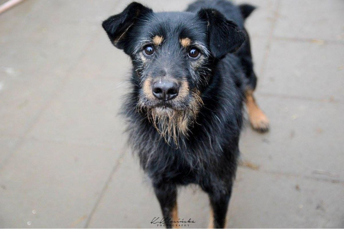 Zanim trafił do schroniska błąkał sie kilka tygodni po polach uprawnych, stroniąc od ludzi, czego skutkiem jest strach wobec nich.